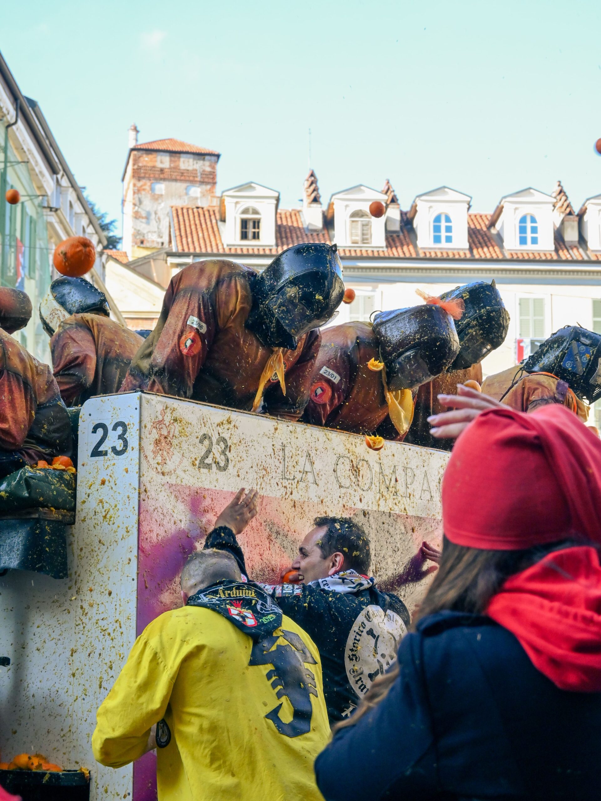 Ed è proprio il lancio delle arance ad attirare frotte di visitatori, visitatrici e persone curiose del folklore tipico del Carnevale d’Ivrea, nonché ad attirare su di sé le critiche di chi si interroga sul senso dell’enorme spreco di cibo provocato dalla festa. Le aziende agricole del sud che ogni anno riforniscono Ivrea di arance, per quasi 200mila euro annui, assicurano che in ogni caso le arance che vengono usate non potrebbero essere destinate al consumo alimentare. Si tratta infatti di arance di seconda o terza scelta, che dopo la battaglia vengono raccolte dalle strade e trasformate in compost negli impianti di Asti e Santhià. Niente da temere, dunque, anche per le persone più attente all’ambiente.