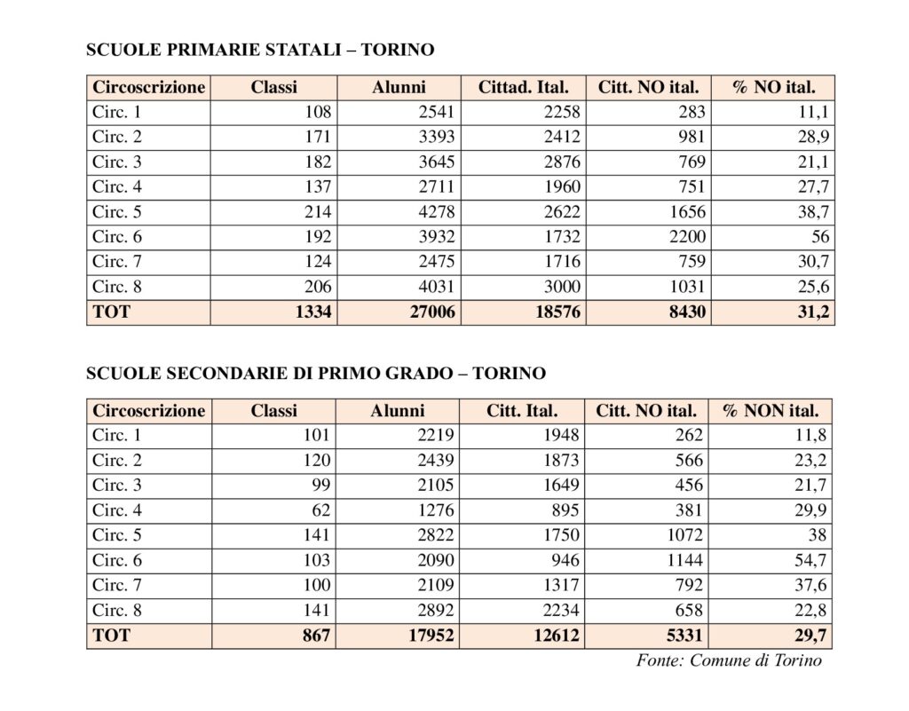 Nell’anno scolastico 2024/2025 nelle scuole primarie gli alunni sono stati in totale 27.006. Di questi 8.430 sono senza cittadinanza italiana. Per quanto riguarda le scuole secondarie di primo grado – le medie – gli alunni sono stati 17.952, 5.331 con cittadinanza non italiana. Le tabelle qui sotto mostrano il numero di alunni divisi per circoscrizione e le relative percentuali.