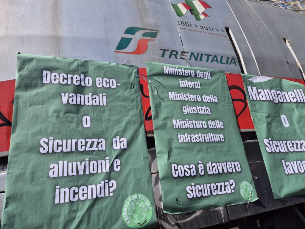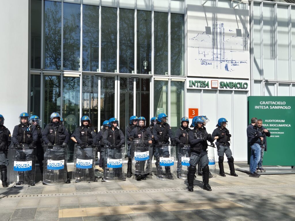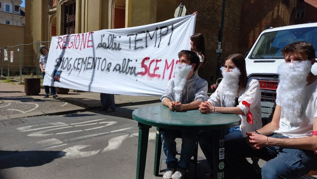 Guidato da una camionetta con sopra casse per la musica, bandiere e dj set, il corteo si dirige senza fretta verso piazza Castello, non mancando di fare alcune tappe strategiche. Davanti al grattacielo di Intesa Sanpaolo, alcuni attivisti e attiviste si sono sdraiate sul cemento e cosparse di vernice nera per protestare contro gli investimenti della banca in favore dei combustibili fossili. A bloccare l’ingresso del grattacielo era presente un presidio di decine di agenti della polizia in assetto antisommossa, rimasti però sul posto. Un’altra sosta davanti alla sede di Unione Industriali e infine davanti a Palazzo Lascaris, sede del Consiglio regionale del Piemonte.