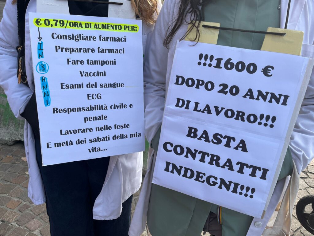 “È la prima volta che sciopero in vent’anni di lavoro, ma stavolta proprio si doveva – racconta una manifestante -. Dal 2011 abbiamo avuto un aumento salariale di soli 187 euro, io ne prendo 1.600 euro al mese: tanto quanto un commesso, dopo aver svolto però anni di studi universitari. Inoltre svolgiamo un numero sempre più alto di mansioni”. Sotto accusa c’è infatti il valore degli stipendi, ritenuto inadeguato in confronto al carovita e troppo basso per il numero di attività svolte dalle farmacie, diventate sempre più “farmacie dei servizi”: “Facciamo tutto, dalla telemedicina ai vaccini e Federfarma vuole corrisponderci la metà dell’aumento richiesto, di 360 euro, che dovrebbe colmare il carovita”, dice un altro farmacista. “Oggi i laureati in farmacia sono sempre di meno, in un momento in cui una farmacia necessita di più addetti per gli aumentati servizi – gli fa eco una collega -. Oltre alla crisi delle vocazioni per le professioni sanitarie, influiscono anche i costi che noi farmacisti dipendenti dobbiamo sostenere per lavorare: dobbiamo pagare l’Ordine e l’Empaf, il nostro ente previdenziale, di fatto guadagnando meno di un commesso che non deve pagare nessun ordine”. Altri manifestanti segnalano che diversi colleghi hanno deciso di non partecipare “per paura di ripercussioni da parte del titolare”: “Siamo molto vulnerabili anche da questo punto di vista”.